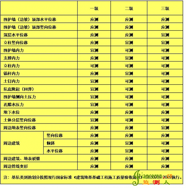 4.1.3基坑工程的監(jiān)測項(xiàng)目應(yīng)與基坑工程設(shè)計(jì)、施工方案相匹配。應(yīng)針對監(jiān)測對象的關(guān)鍵部位,做到重點(diǎn)觀測、項(xiàng)目配套并形成有效的、完整的監(jiān)測系統(tǒng)。