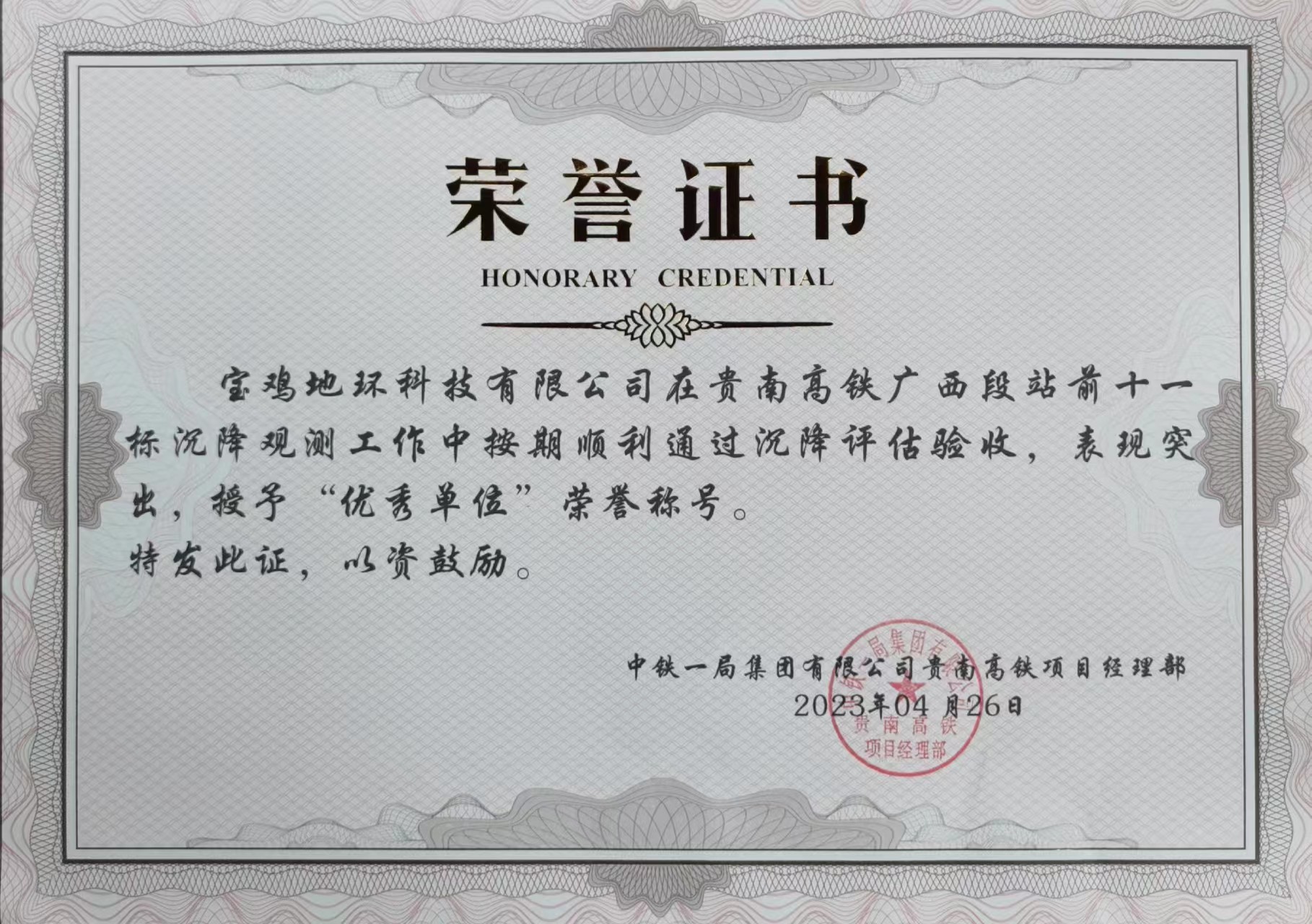 寶雞地環(huán)測(cè)繪人努力拼搏的精神,受到了中鐵一局集團(tuán)有限公司貴南高鐵項(xiàng)目經(jīng)理部領(lǐng)導(dǎo)的高度贊揚(yáng)和肯定。