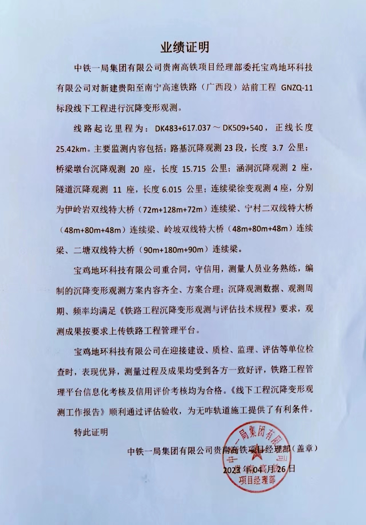 中鐵一局集團(tuán)有限公司貴南高鐵項(xiàng)目經(jīng)理部委托寶雞地環(huán)科技有限公司對(duì)新建貴陽至南寧高速鐵路 (廣西段)站前工程 GNZQ-11標(biāo)段線下工程進(jìn)行沉降變形觀測(cè)。